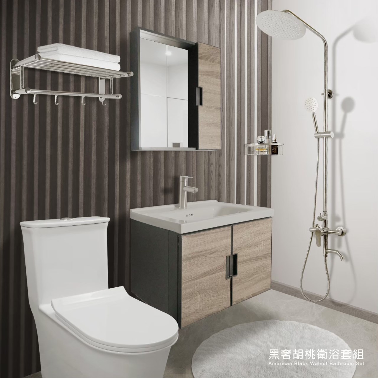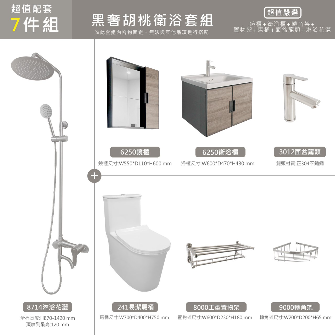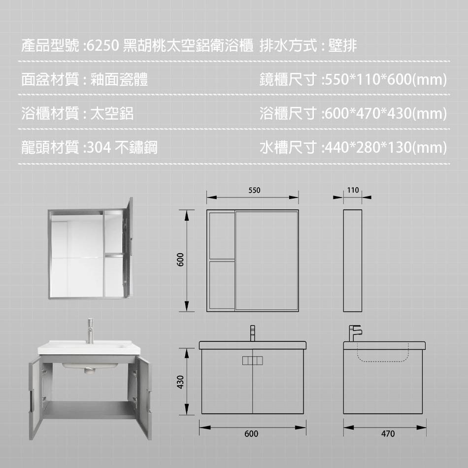 ● 鏡櫃尺寸:W550*D110*H600 mm ● 衛浴櫃尺寸:W600*D470*430 mm ● 置物架尺寸:W600*D230*180 mm ● 轉角架尺寸:W200*D200*65 mm ● 馬桶尺寸:W710*D380*H720 mm ● 花灑靠牆尺寸:W120*D80*H950-1400 mm