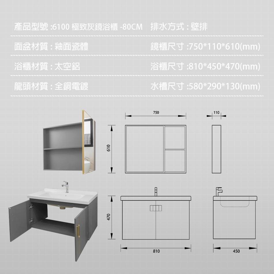 ● 排水方式:壁排 ● 主體材質:新型防水太空鋁 ● 鏡櫃尺寸:W750*D110*H610 mm ● 浴櫃尺寸:W710*D450*H470 mm ● 水槽尺寸:W580*D290*H130 mm ● 附贈:3000龍頭