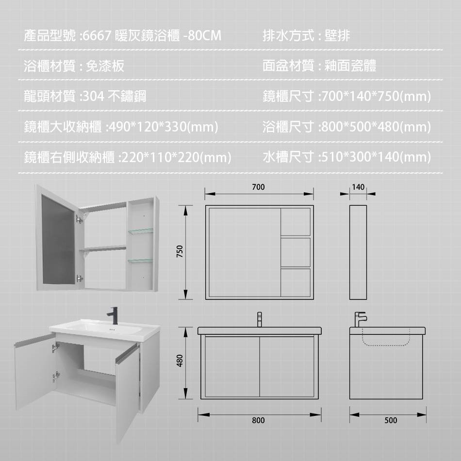 ● 排水方式:壁排 ● 主體材質:免漆板 ● 鏡櫃尺寸:W700*D140*H750 mm ● 浴櫃尺寸:W800*D500*H480 mm ● 水槽尺寸:W510*D300*H140 mm ● 附贈:3012龍頭
