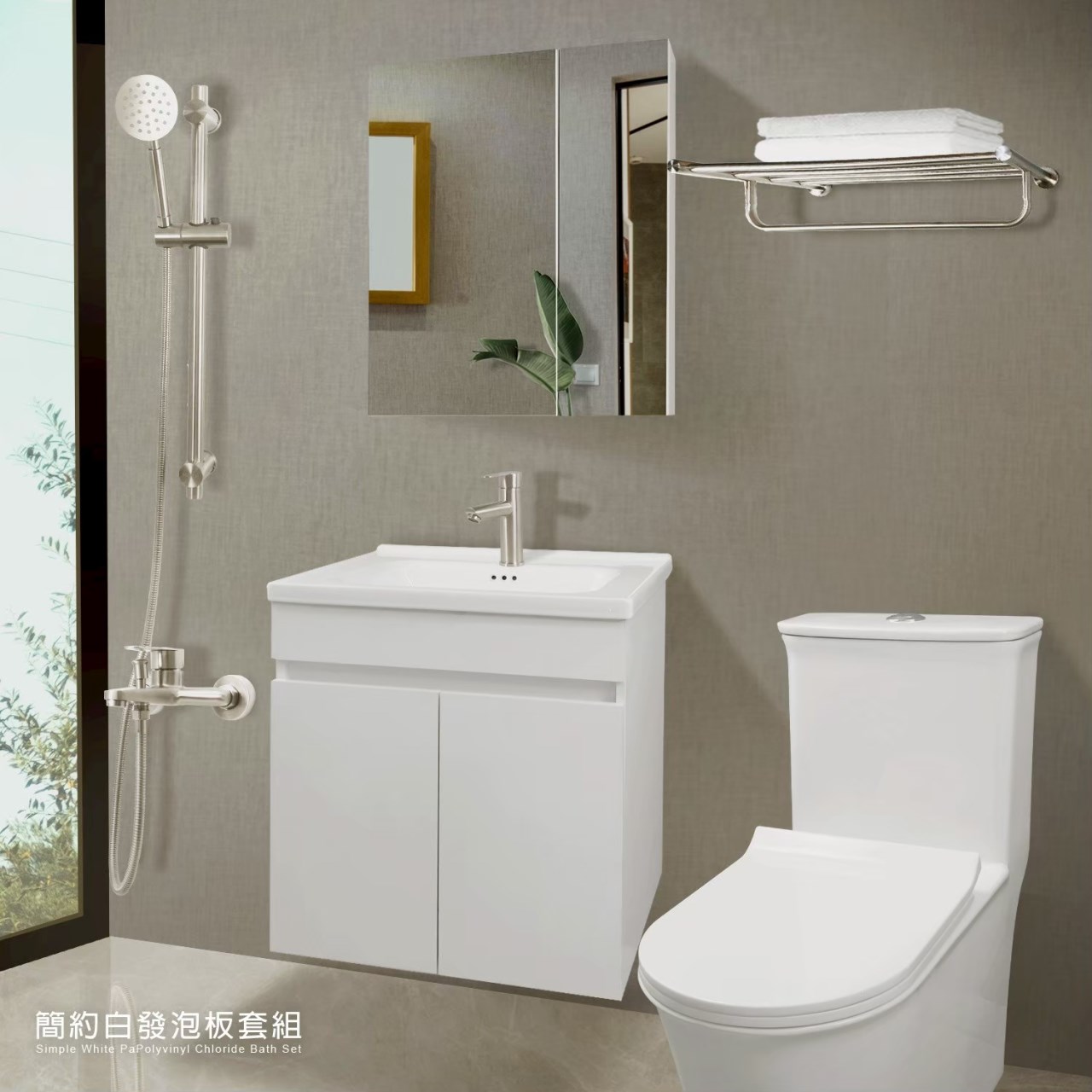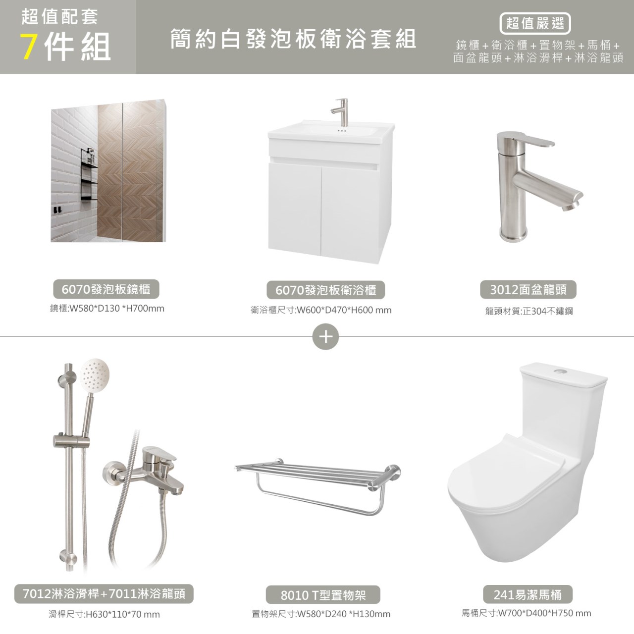 歐客衛浴 100%防水簡約白 7件 潔淨馬桶 60發泡浴櫃鏡櫃 304不鏽鋼面盆龍頭 淋浴滑桿龍頭組 T型置物架 免運費