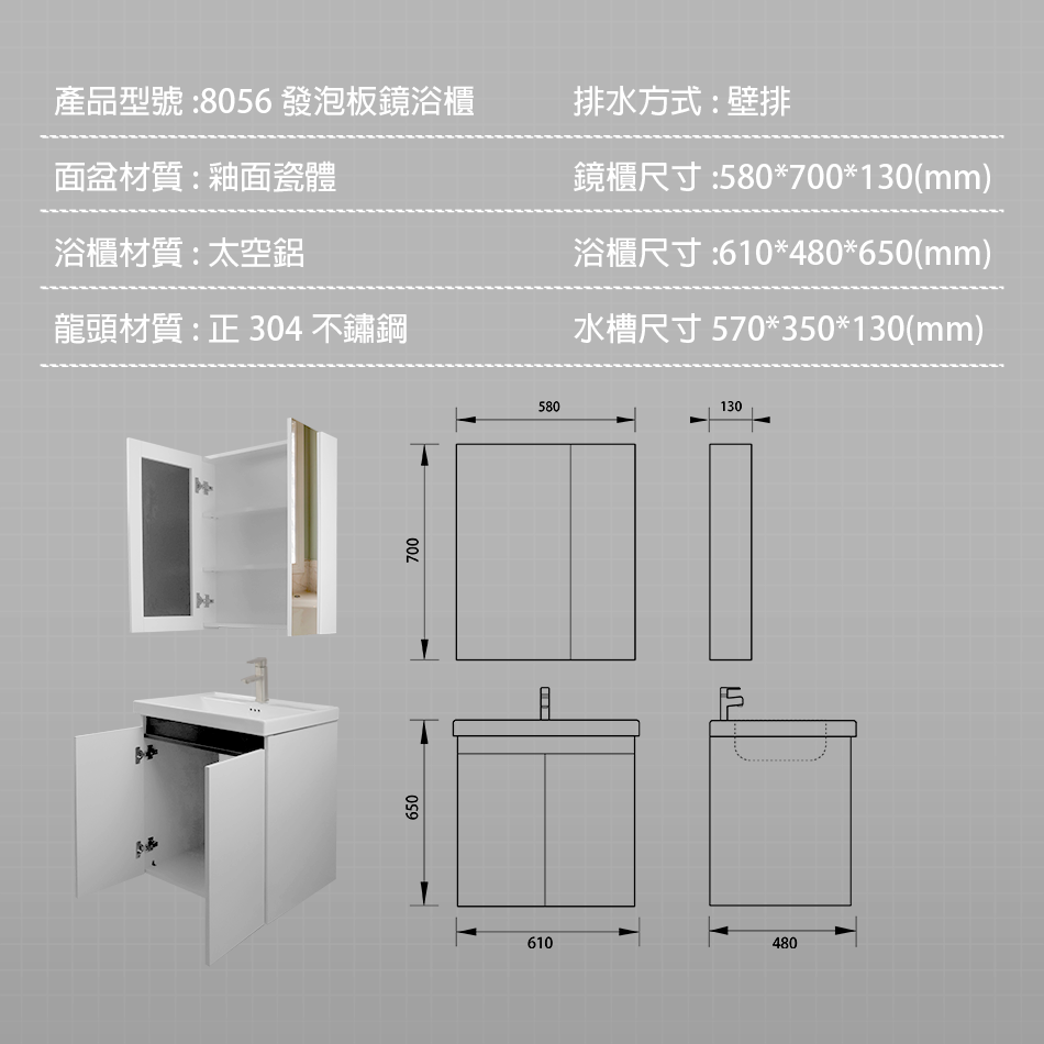 ● 馬桶尺寸:W650*D370*H750 mm ● 鏡櫃尺寸:W600*H450 mm ● 衛浴櫃尺寸:W610*D480*H650 mm ● 置物架尺寸:W580*D240*H130 mm ● 滑桿尺寸:W110*D70*H630 mm ● 花灑長度:H870-1420 mm ● 頂噴到最高:120 mm