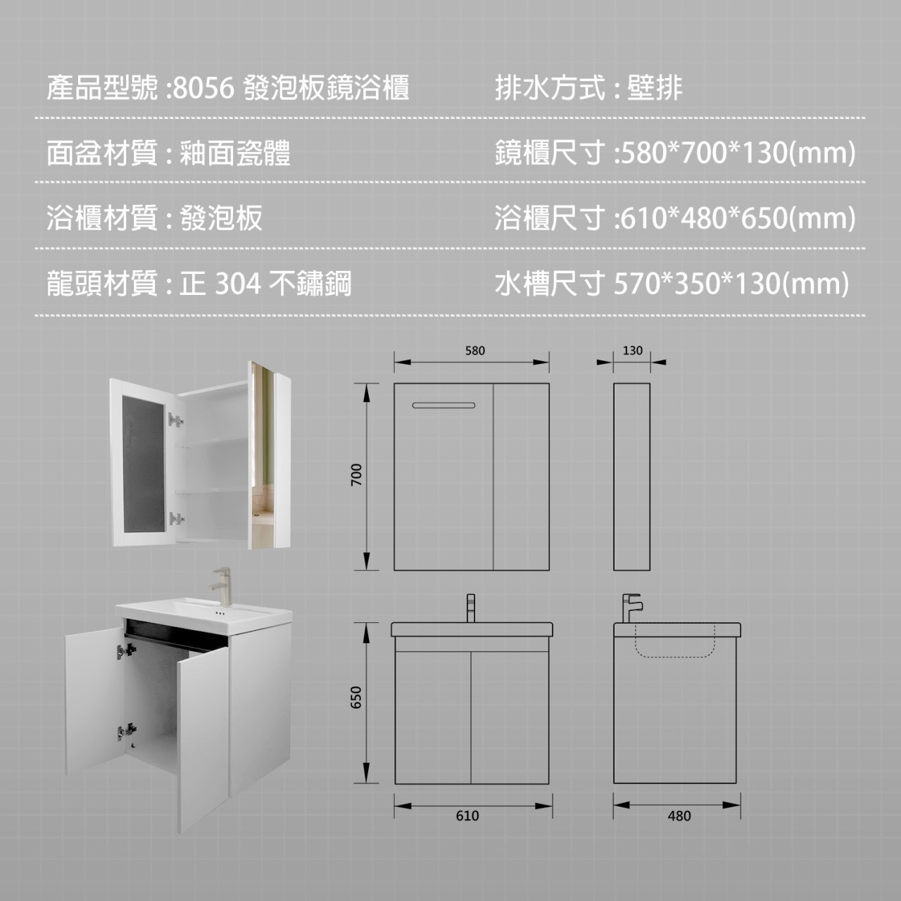 ● 馬桶尺寸:W650*D370*H750 mm ● 鏡櫃尺寸:W580*D130*H700 mm ● 衛浴櫃尺寸:W610*D480*H650 mm ● 置物架尺寸:W580*D240*H130 mm ● 滑桿尺寸:W110*D70*H630 mm ● 花灑長度:H870-1420 mm ● 頂噴到最高:120 mm