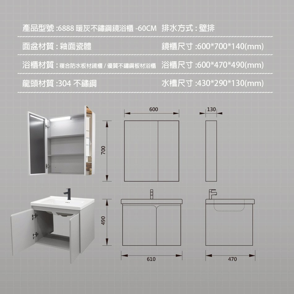 ● 鏡櫃尺寸:W600*D130*H700 mm ● 衛浴櫃尺寸:W610*D470*490 mm ● 馬桶尺寸:W680*D380*H710 mm