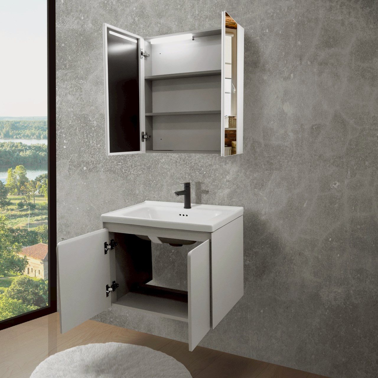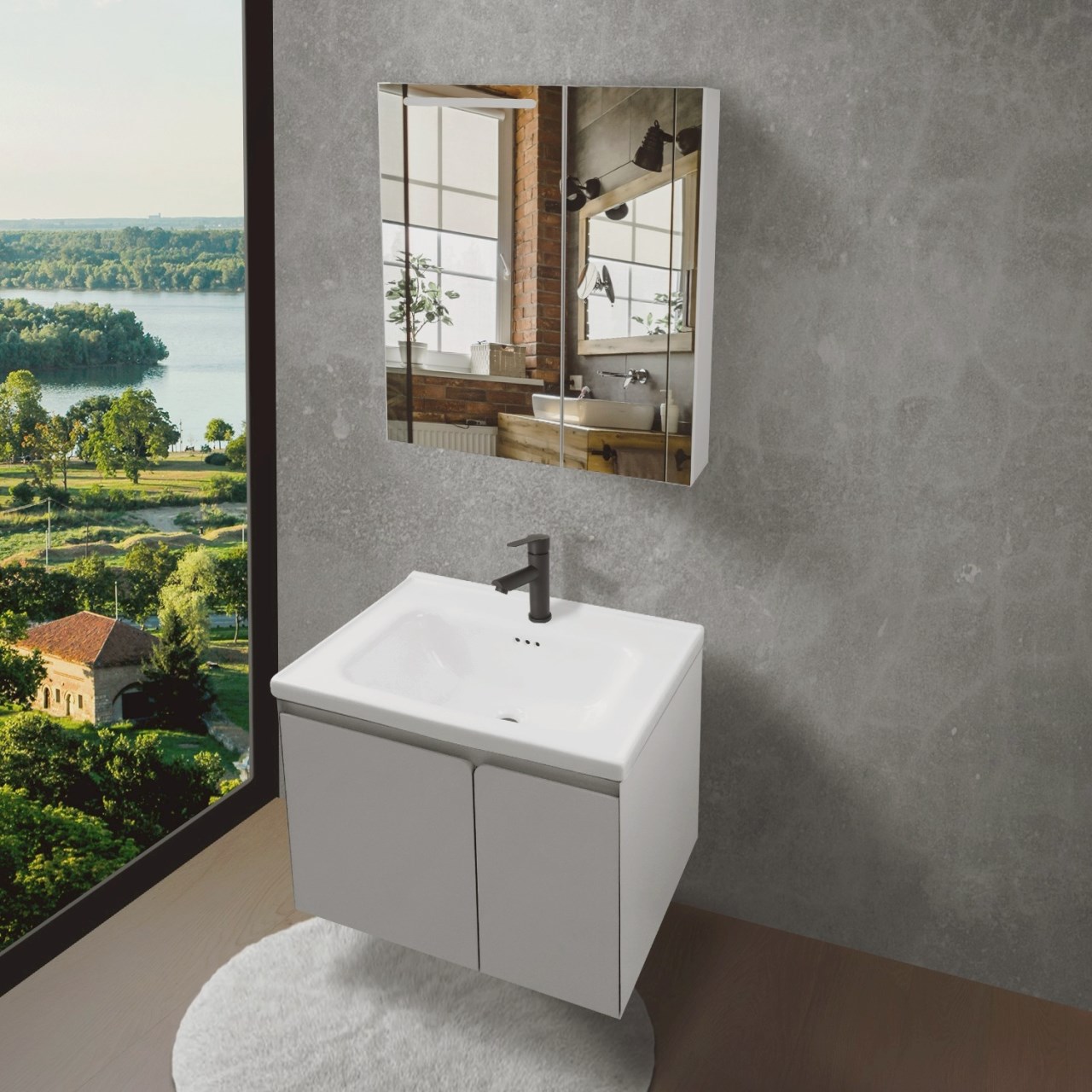 6888暖灰不鏽鋼 60公分 鏡櫃浴櫃 釉面白瓷一體盆 質感黑304不鏽鋼龍頭