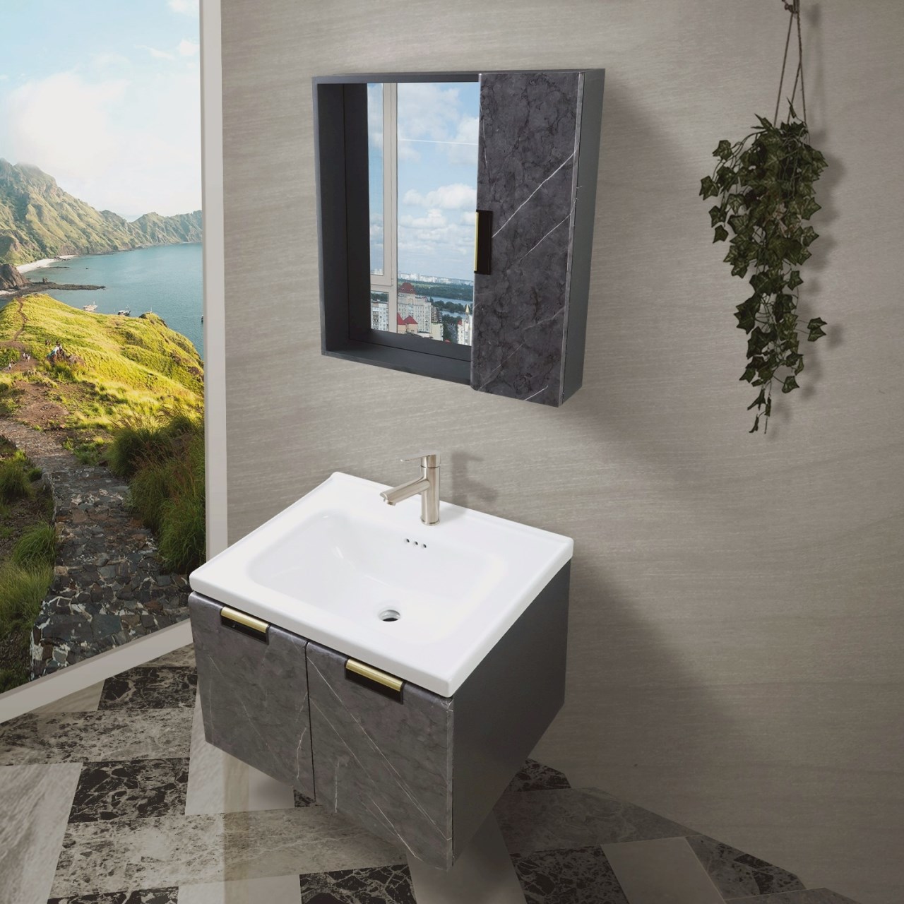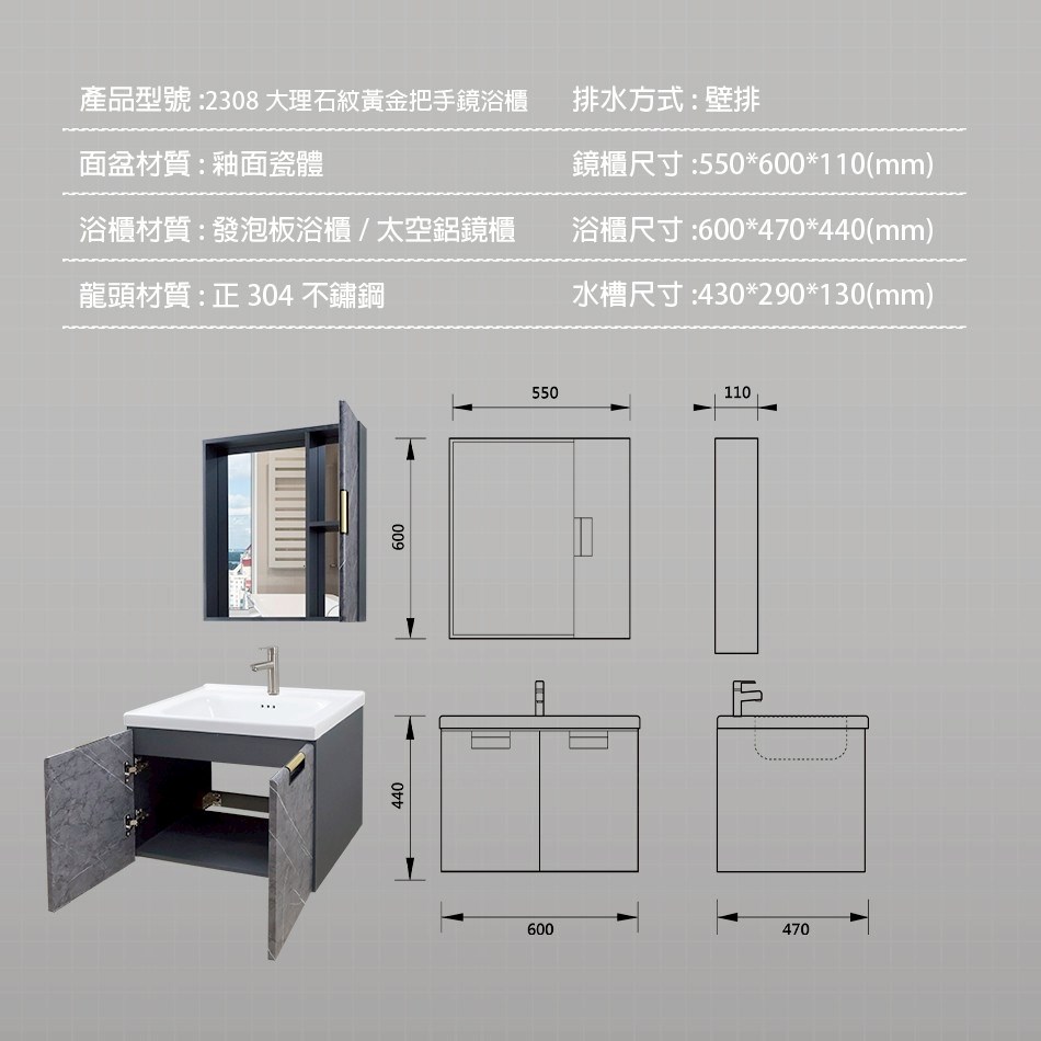 2308大理石紋黃金把手 60公分發泡板鏡櫃浴櫃 釉面白瓷一體大盆 304不鏽鋼龍頭