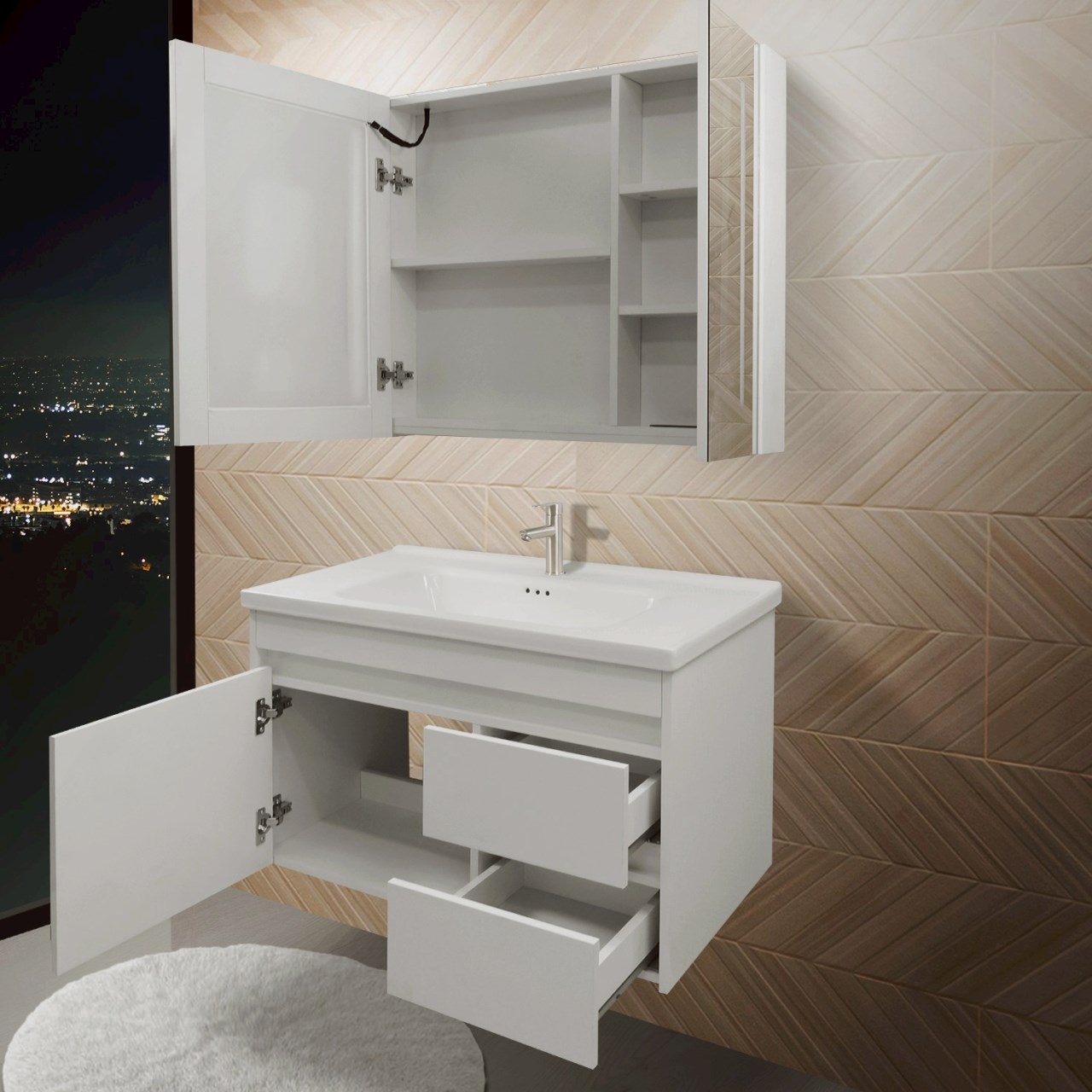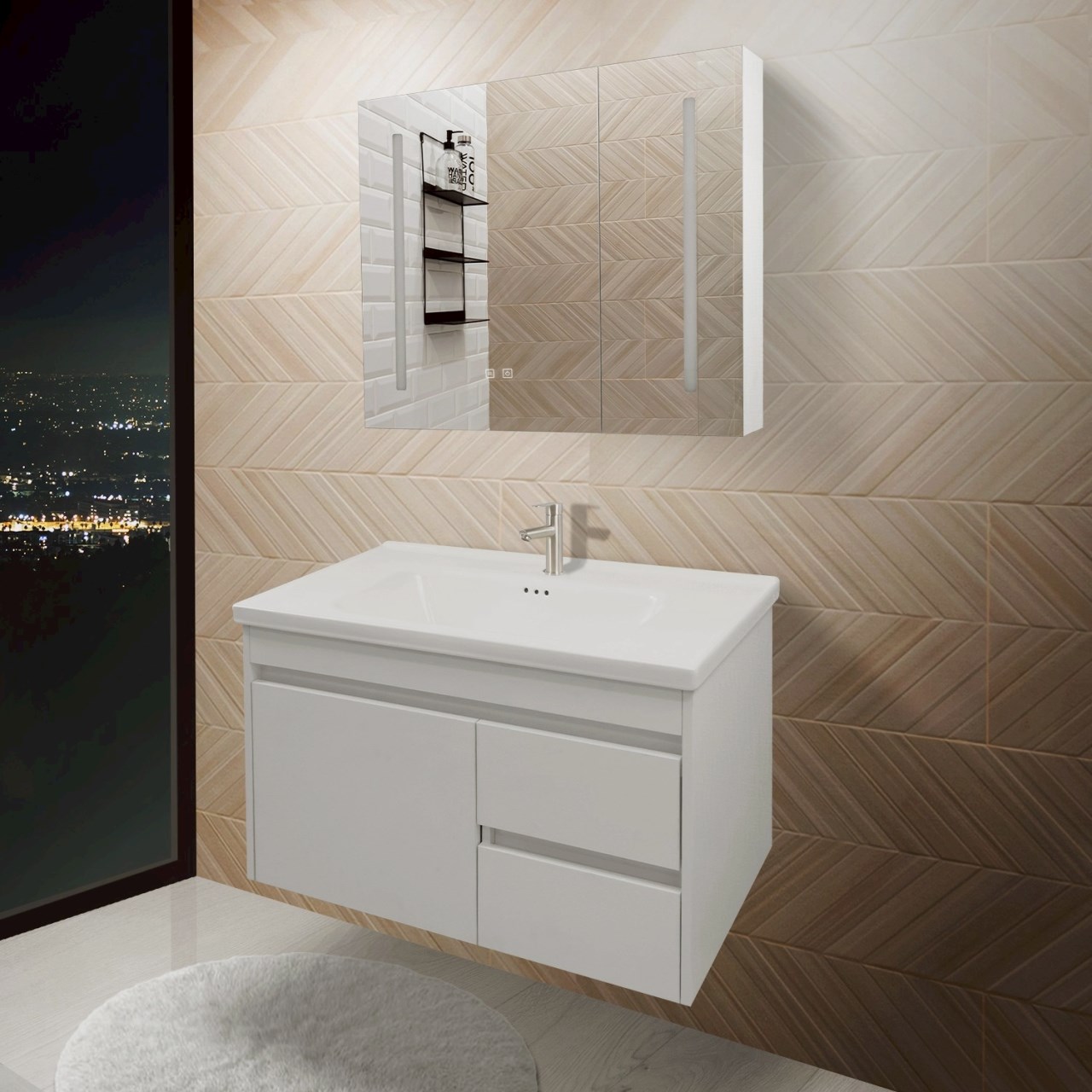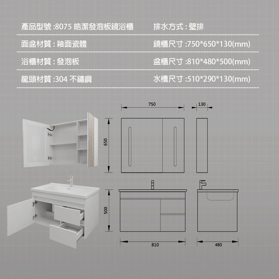 皓白系列 7件 80公分發泡板鏡櫃浴櫃 易潔馬桶 不鏽鋼面盆龍頭 不鏽鋼淋浴滑桿龍頭組
