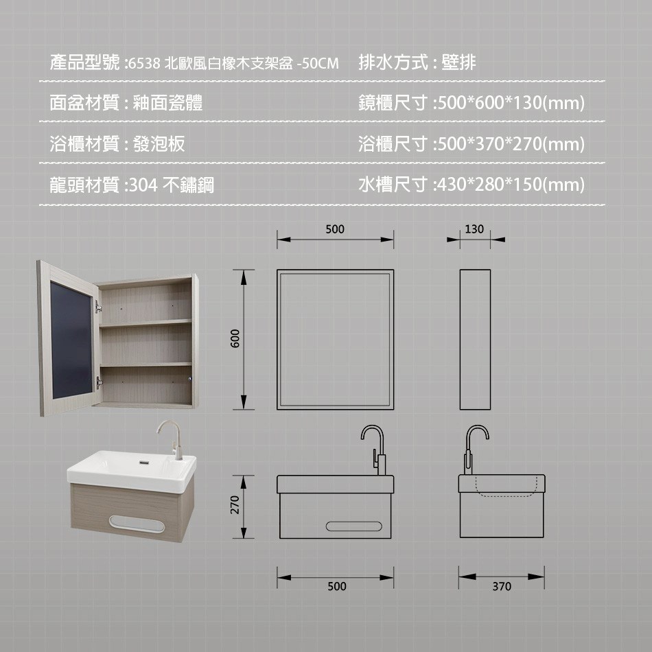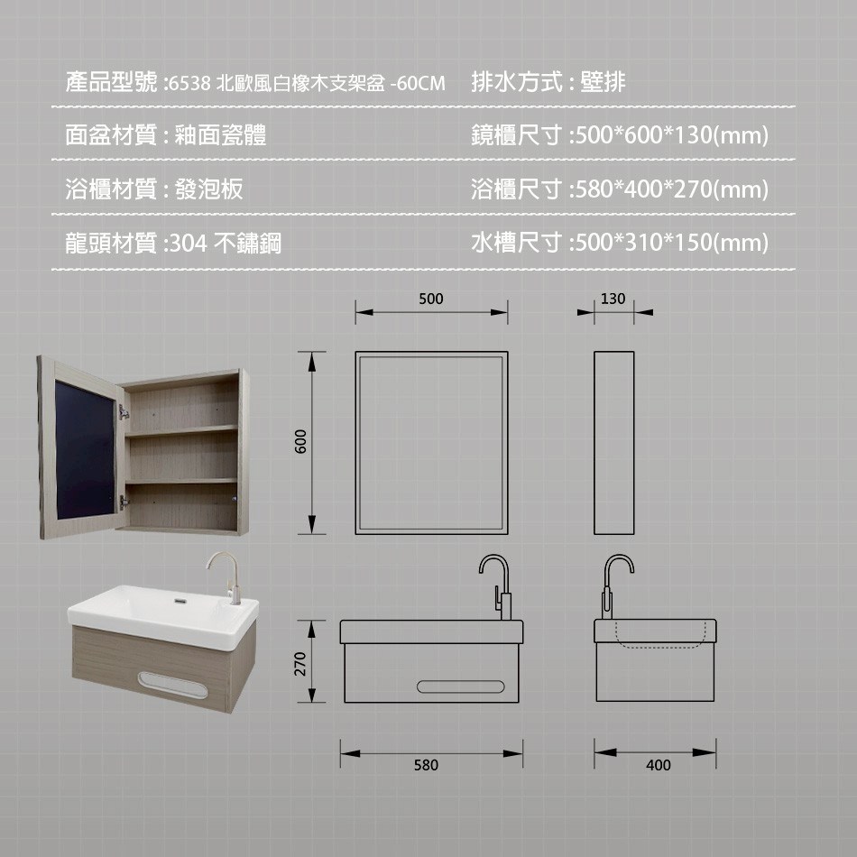 北歐板系列 - 50/60公分 鏡櫃 支架盆 潔淨馬桶 不鏽鋼面盆龍頭 淋浴龍頭組 櫃盆材質:抗汙釉面窯燒陶瓷 櫃體材質:高密度防水發泡板 整組尺寸(含盆):寬60/50*深40/37*高27公分 鏡櫃材質:高密度防水發泡板、鏡子 鏡櫃尺寸:寬50*深13*高60 公分 ※衛浴設備為大型貴重物品,因含有陶瓷品為易碎品收到商品時請立即開箱檢查,若遇有破損瑕疵請於收貨當下,馬上拍照或是我們聯繫退換貨,否則視為商品無誤送達無法接受退換。 ※有配合專運易碎品之貨運運送,貨運只送至一樓。 ※此套組不包含安裝工資,如需衛浴設備安裝服務,詳細安裝費用請洽詢。
