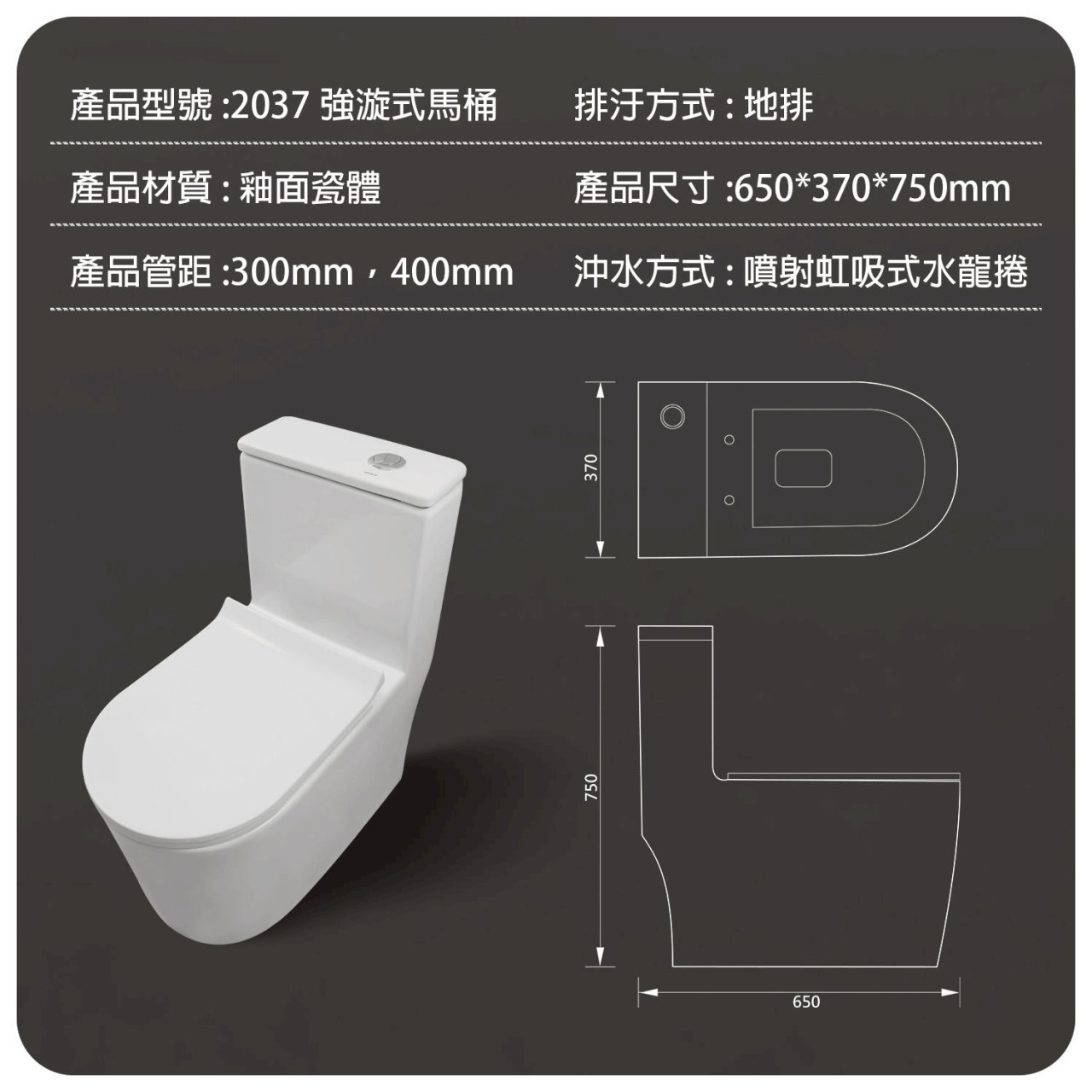 單體陶瓷馬桶(智潔釉面)尺寸: W650 X D370 XH750 /mm