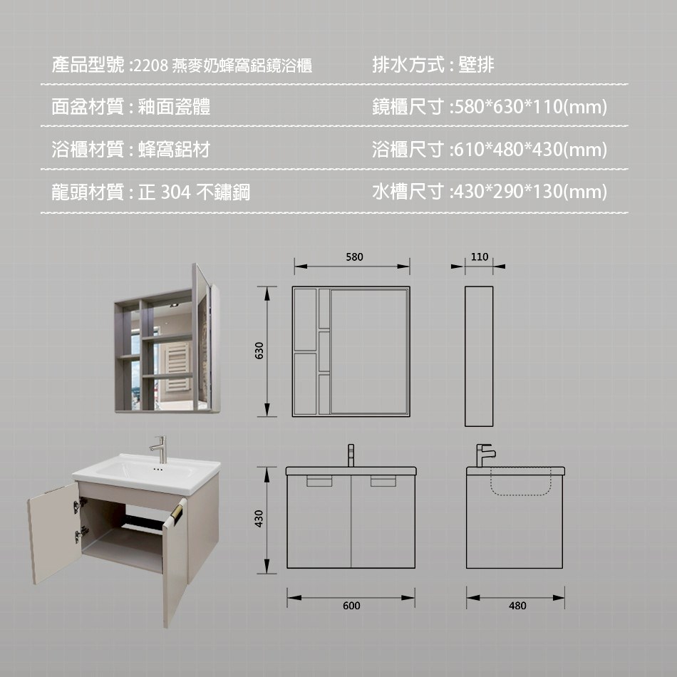 鏡櫃尺寸 : W580 X D110 X H630 / mm 浴櫃尺寸 : W610 X D480 X H430 / mm