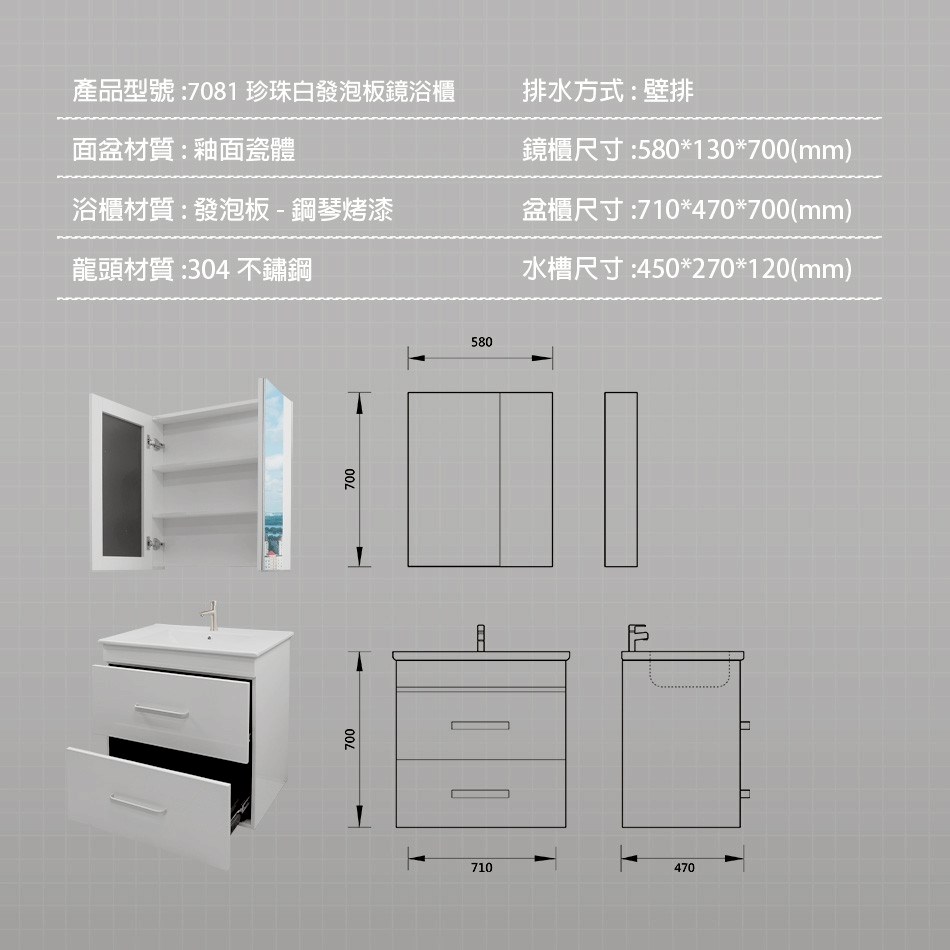 > 出清免運 完全防水 珍珠系列3件 70公分發泡板浴櫃鏡櫃 不鏽鋼龍頭
