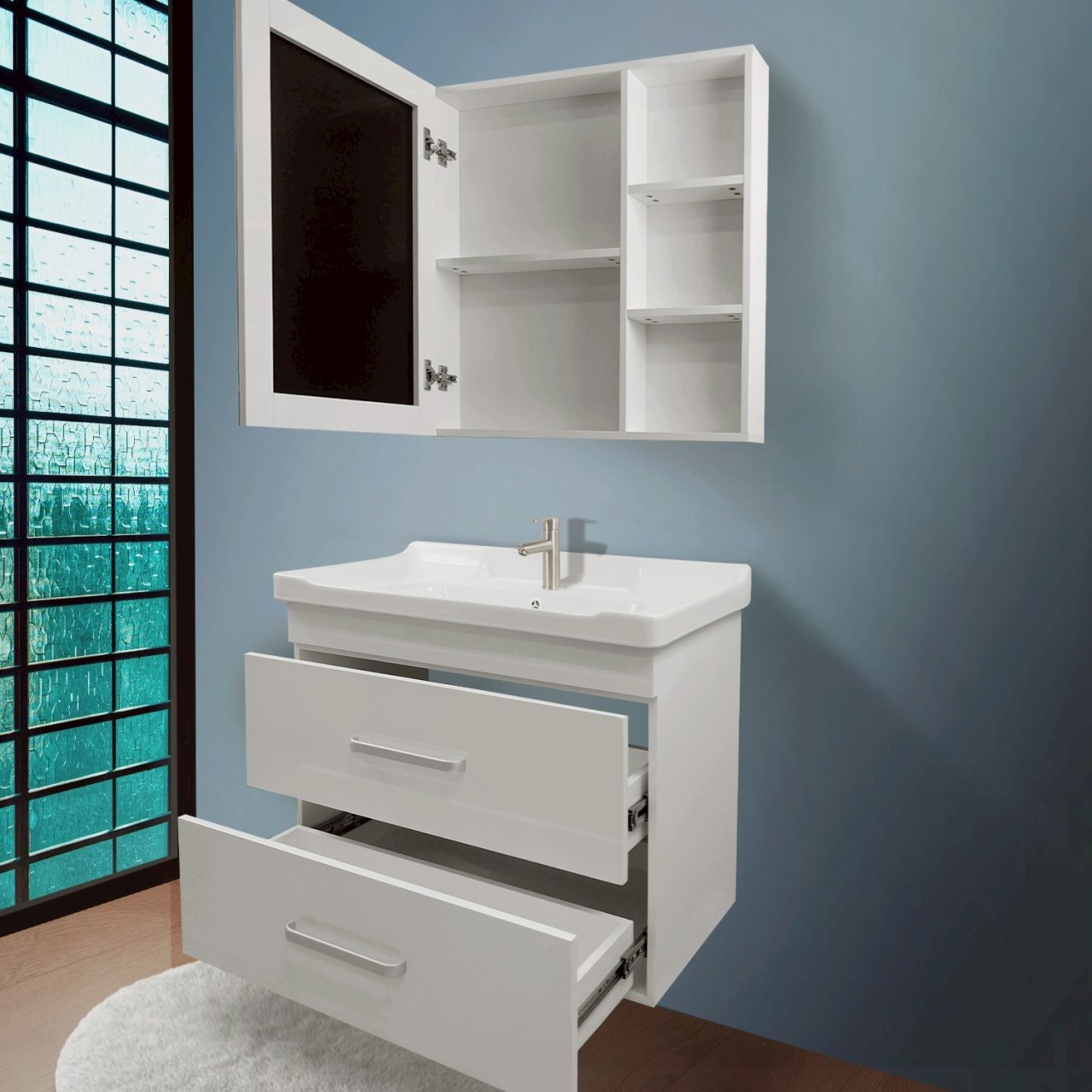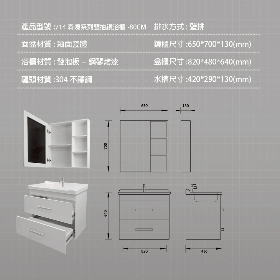 面盆: 釉面陶瓷一體成型 浴櫃: PVC 龍頭:304不鏽鋼 鏡櫃尺寸:650X700130/mm 櫃體尺寸:820X480X640/mm 水槽尺寸:420X290X130/mm ◎手工測量略有誤差值